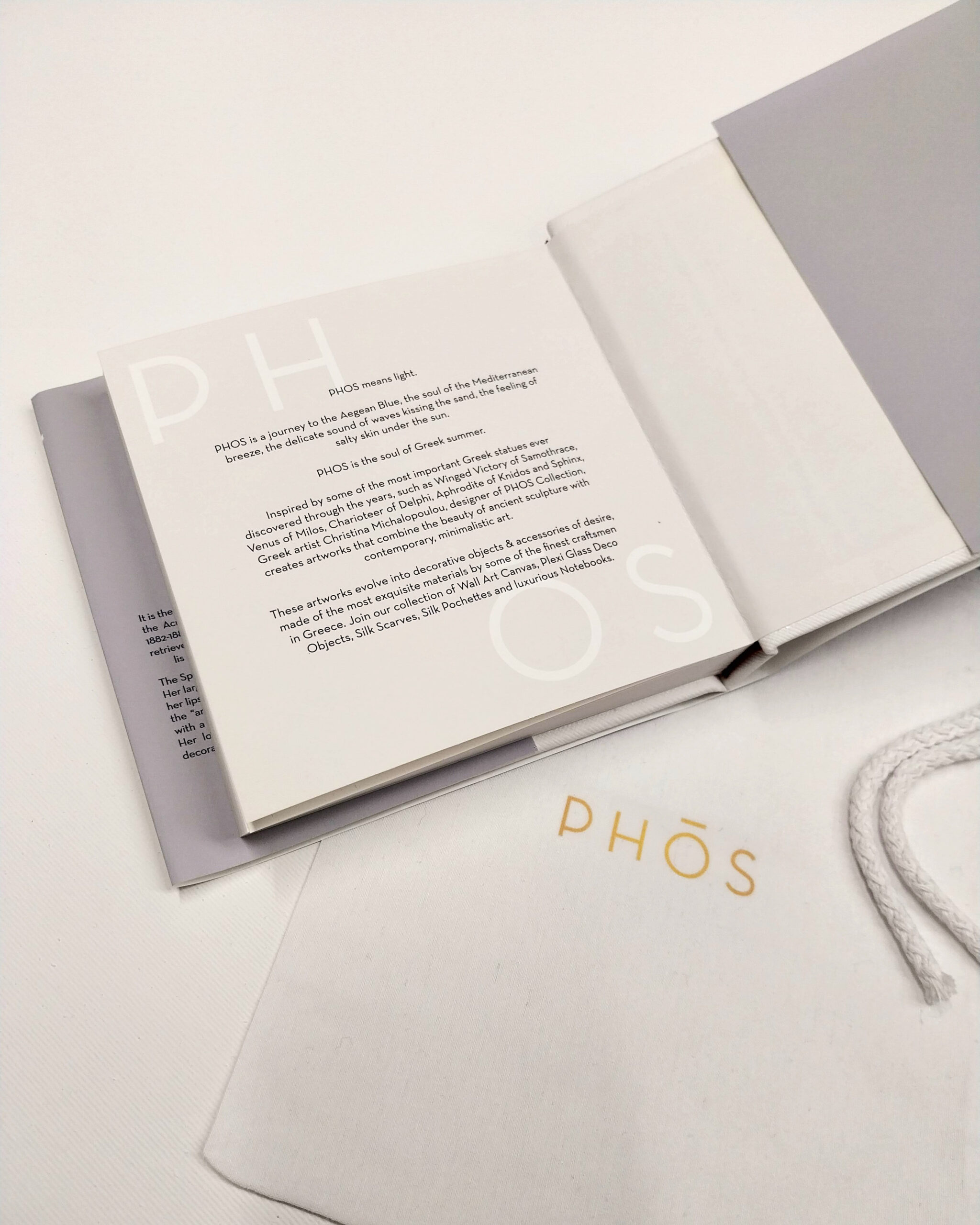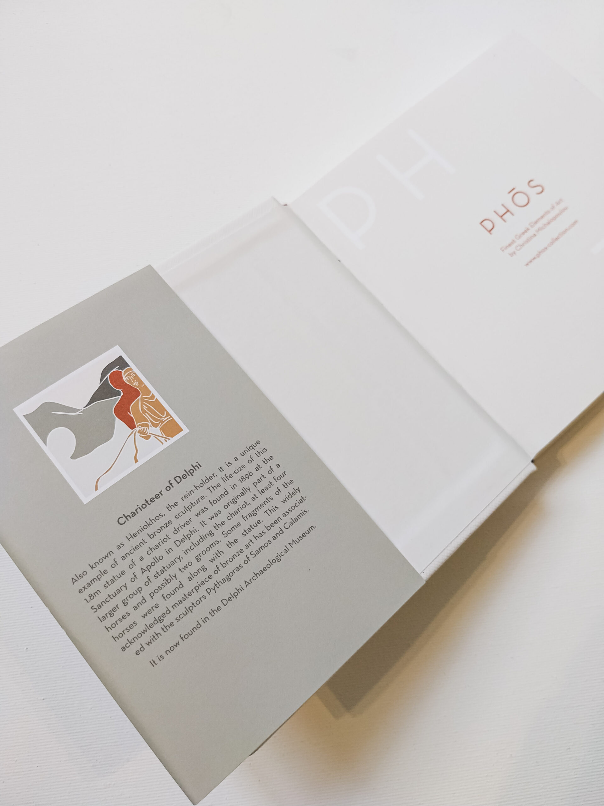 It's paper cover, masterfully designed and printed, presents the captivating stories of the five iconic Phos statues: Winged Victory of Samothrace, Venus de Milos, Charioteer of Delphi, Aphrodite of Knidos and Sphinx Statue at the front and the philosophy of Phos Collection at the back side.