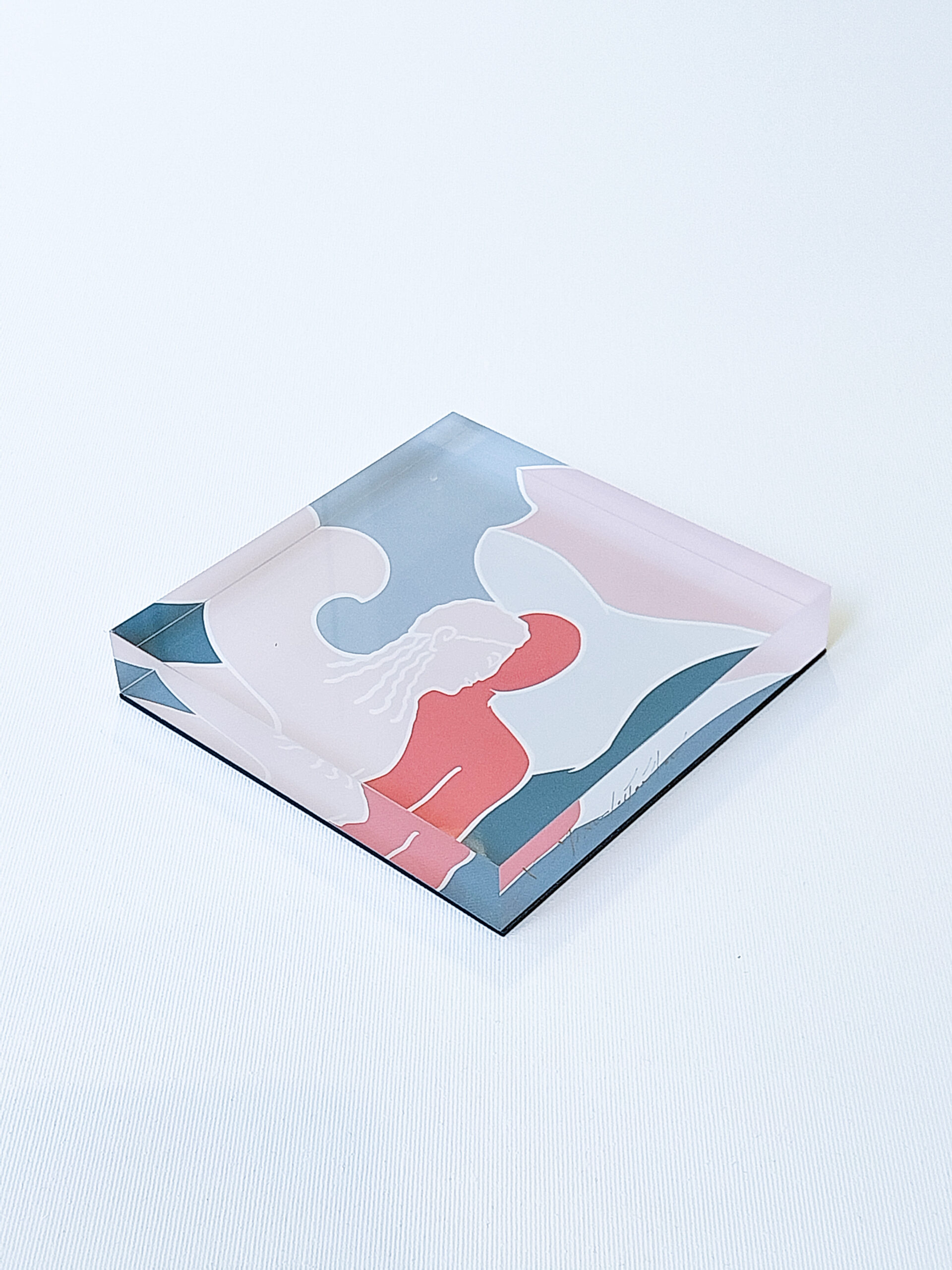 Finest plexi glass decoration items of desire in a minimalistic style, in a luxurious, handmade packaging of white box with an internal frame to protect the product. With a golden Phos logotype at the back.